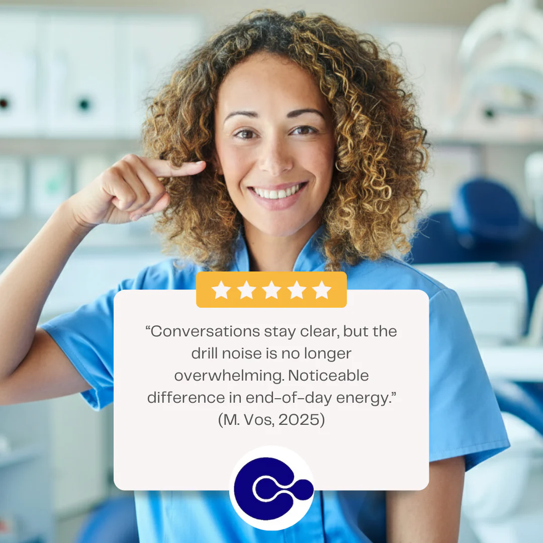 Dentists work all day with high-frequency drill noise and continuous vacuum suction, both of which can cause hearing damage, tinnitus, and mental fatigue. Proper earplugs reduce these peaks while keeping speech clear, leading to less strain and noticeably more energy at the end of the day.